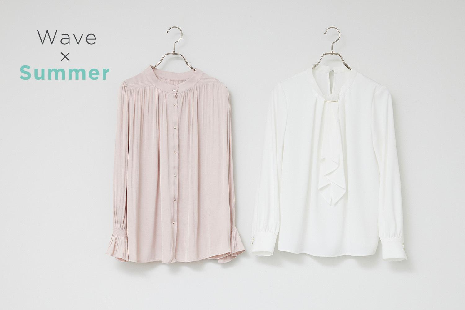 (右)サマーが似合うピンクは、少しくすみのある青みがかった色。ウェーブが得意なとろみ素材のブラウスで取り入れると、上品な印象に仕上がります。マットな質感のシルバーのボタンもサマーにも似合うポイント。ウェーブはタックインして着こなすのが◎。