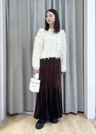 (中)ネックラインにパールがついたニットは、さらりと1枚着るだけで、顔周りを華やかに演出してくれます。コンパクトな肩幅、身幅、着丈も似合うポイント。ウェーブが得意とするフレアースカートやテーパードパンツとの相性も◎です。