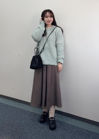 (中)ネックラインにパールがついたニットは、さらりと1枚着るだけで、顔周りを華やかに演出してくれます。コンパクトな肩幅、身幅、着丈も似合うポイント。ウェーブが得意とするフレアースカートやテーパードパンツとの相性も◎です。