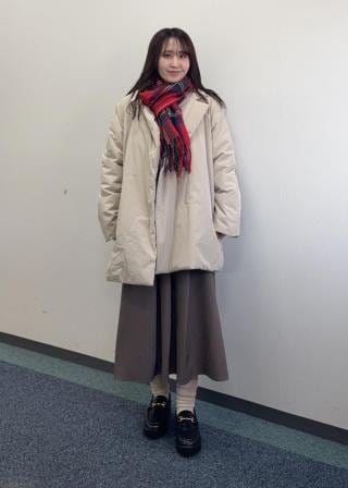 (右)衿元にタックが入ったバルーンブルゾン。胸上部分をカバーしながら、トレンド感も演出できます。首のラインがきれいなウェーブなら、ジップは少しあけて着こなすとさらに◎。袖口はゴムなので、たくしあげて華奢な手首を見せるのもオススメです。