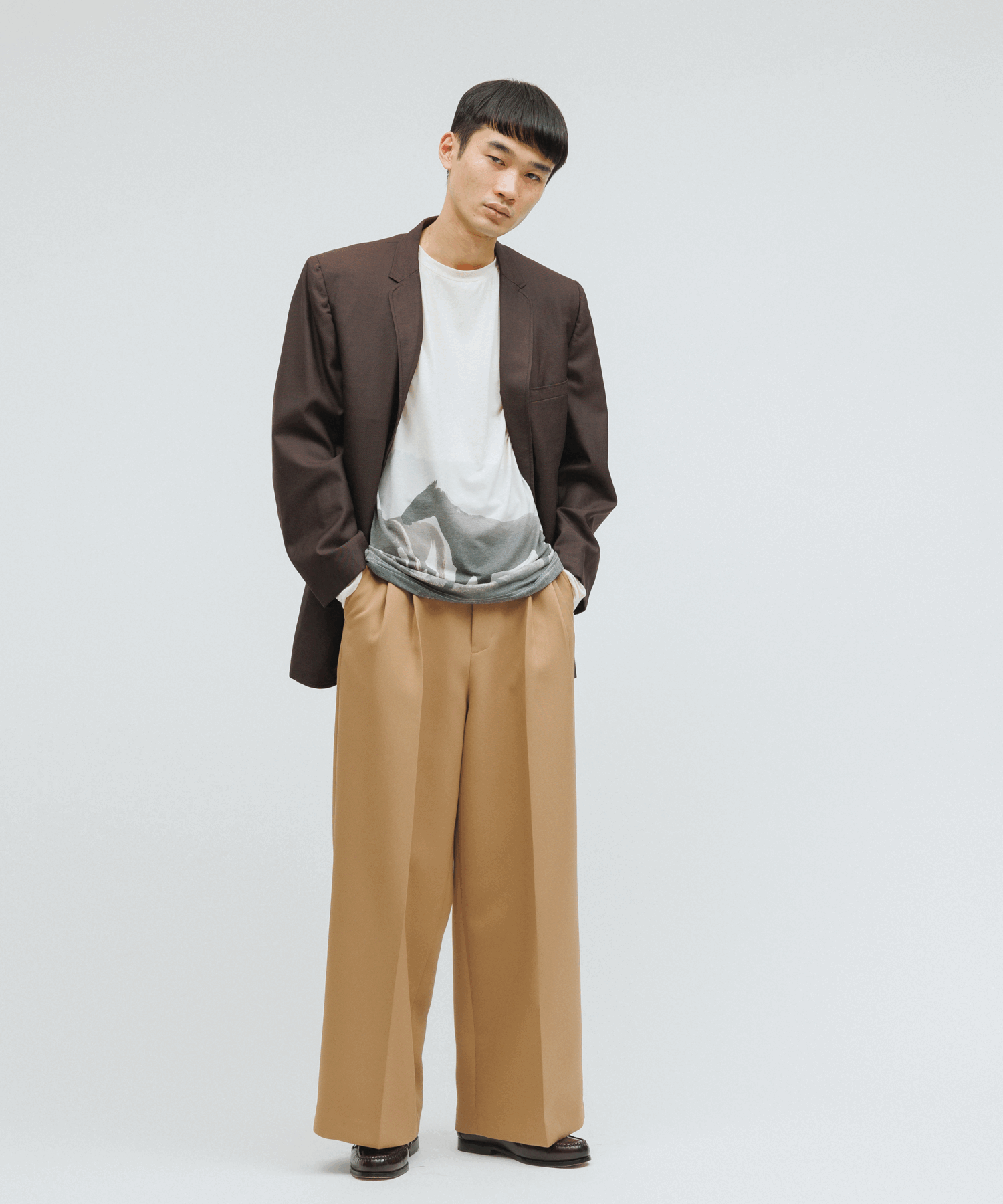 シルエットはタックを取り、運動量を確保した分量感に作りつつも、とろみのある素材を使うことでやぼったくならずにすっきりとした印象に仕上がっているアイテム。