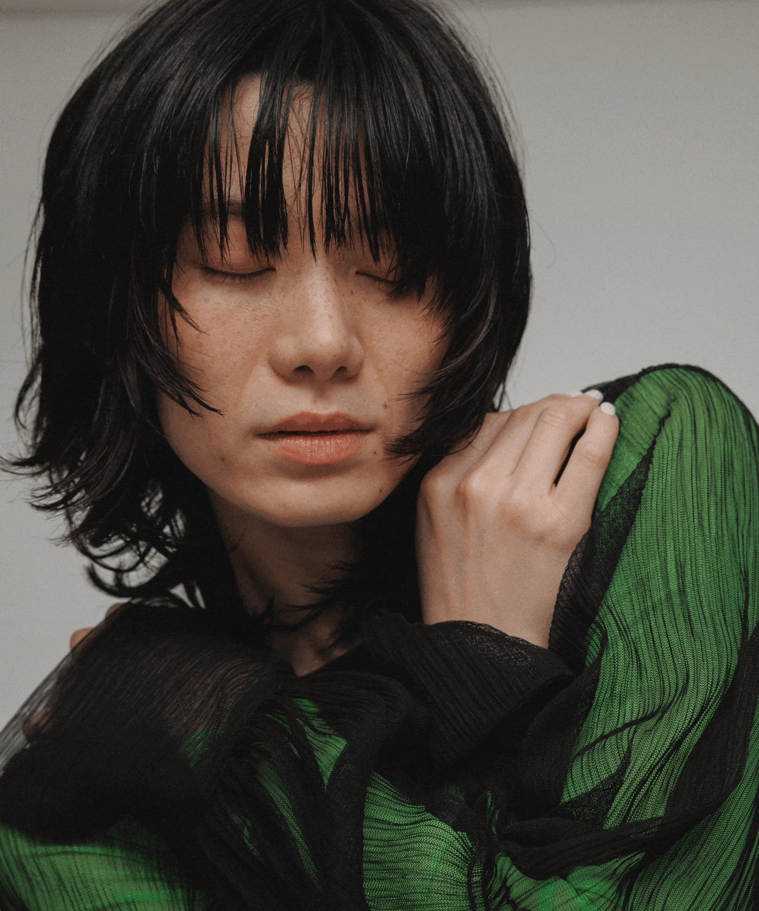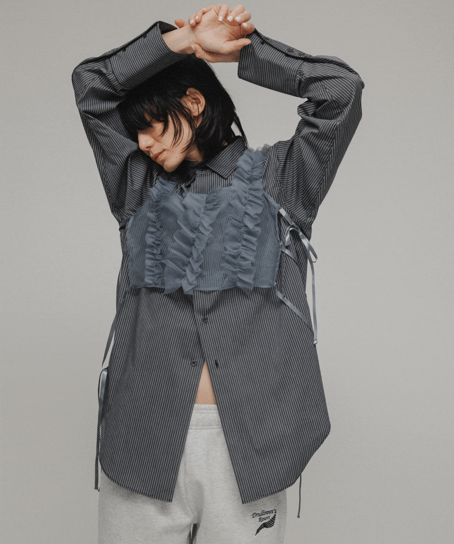 お洋服のアクセントになるコーラルピンクと、よりフリルをモダンに着こなせるチャコールグレー。ニュアンスカラーで甘くなり過ぎない。