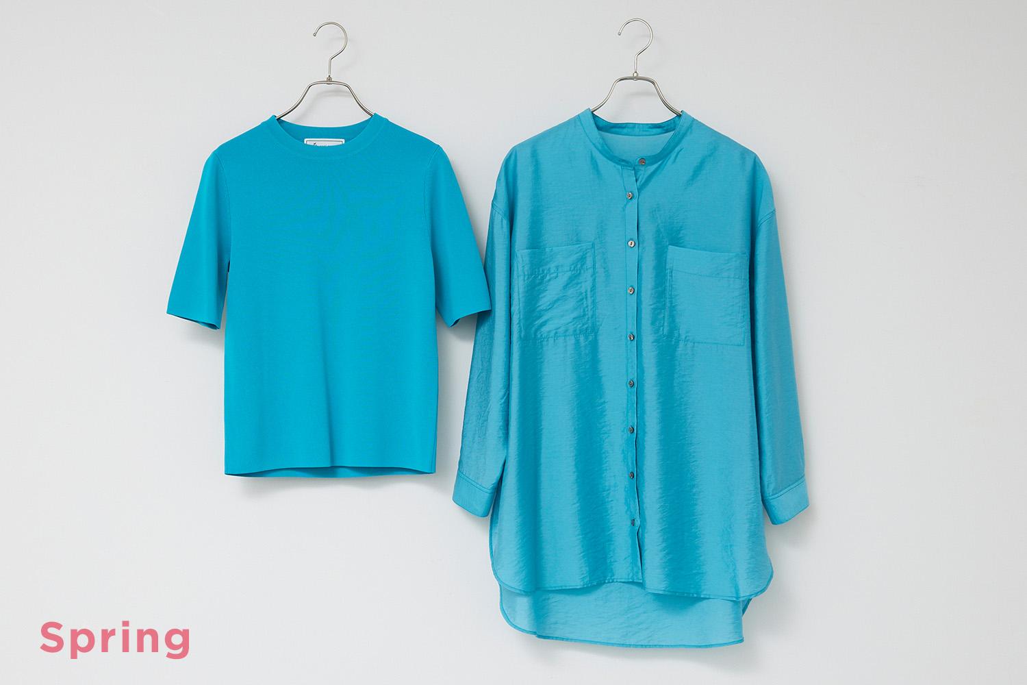 (左)イエベが似合う青は、少し黄みをふくんだ緑に近い色。スプリングなら、彩度が高くクリアなターコイズがオススメです。シンプルなハーフスリーブニットで取り入れれば、さらりと着るだけで一気に春らしいスタイルに。ボトムを選ばず、夏まで活躍するアイテムです。