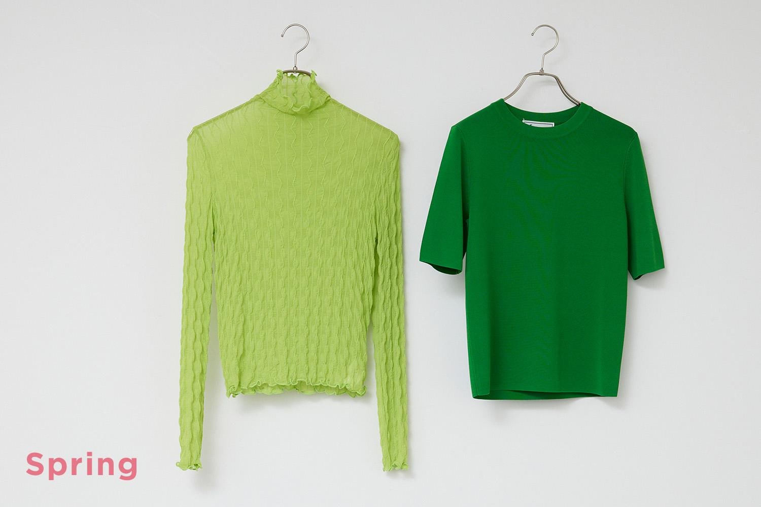 (左)1枚でインパクトのあるジャガードタートル。ハイネックは顔うつりに影響があるので、パーソナルカラーから選ぶのがベスト。今なら春らしさと個性を演出できる黄緑色をチョイス。インナーとして、またインにキャミを合わせて主役として着こなしても◎。