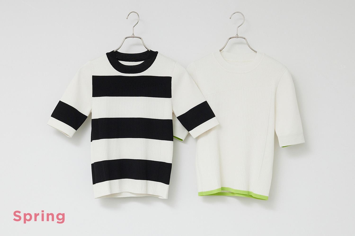 (右)少し黄みがかったホワイトも、アクセントで入った明るい黄緑のラインもまさにスプリングに似合うカラー。袖は折り返して、黄緑をさらにアクセントにすることもできます。1枚あるとスプリングのデイリースタイルに大活躍まちがいなしのアイテムです。