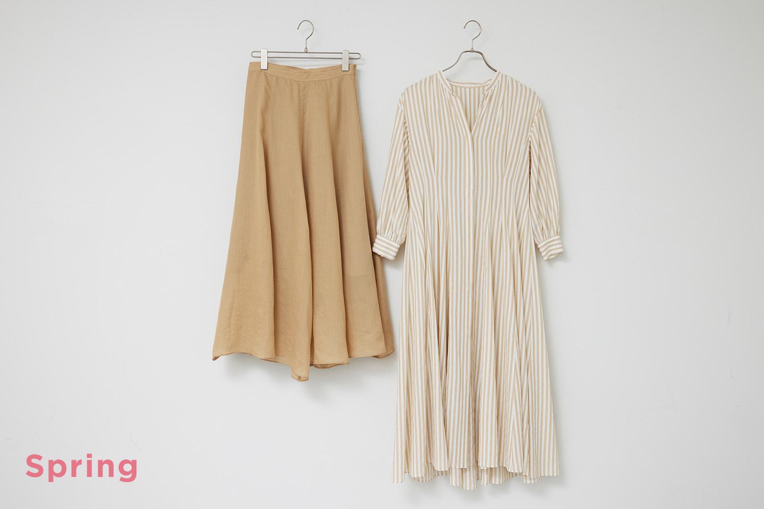 (右)スキッパーシャツのようなリラックス感とドレッシーな雰囲気をあわせ持つ、ストライプのフレアワンピース。くすみのない、まろやかなベージュが、まさにスプリング向き。ワンピはカラーの印象をうけやすいので、パーソナルカラーをしっかり意識して。