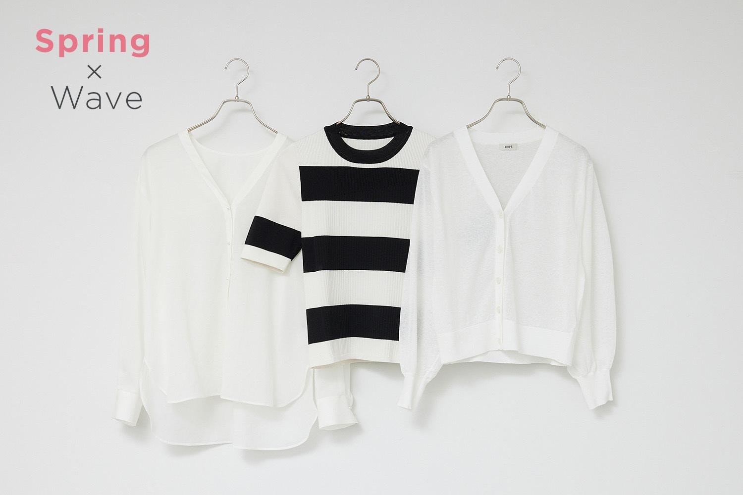 (中)上半身の華奢さをアピールできるリブニットは、ウェーブの得意アイテム。コンパクトな着丈も下重心のウェーブの目線をあげるので◎。スプリングがモノトーンのボーダーを選ぶときは、黄みのあるホワイトを選ぶのがコツ。