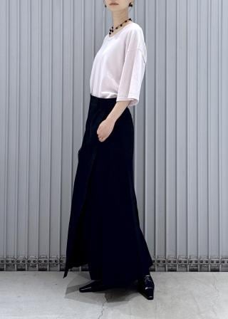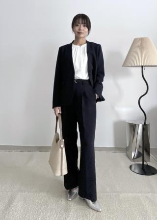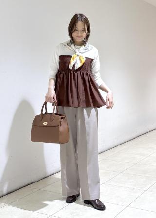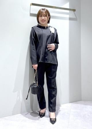(左)てろんとしたやわらかな素材とシアーな質感が特徴のブラウスは、まさにウェーブ向き。装飾のあるデザインも得意なので、小さなパールボタンも似合うポイントです。ボトムインすると、さらにバランスよく着こなせます。