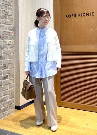 (右)小さなパールボタンがアクセントについたブラウス。さらりとしたドライな質感なので、夏のはおりとしても使えます。スプリングに似合う黄みのあるホワイトは、濃い色とコーデすれば、ぬけ感を演出し、淡い色とならコーデをやさしい雰囲気に仕上げます。