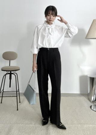 (左)てろんとしたやわらかな素材とシアーな質感が特徴のブラウスは、まさにウェーブ向き。装飾のあるデザインも得意なので、小さなパールボタンも似合うポイントです。ボトムインすると、さらにバランスよく着こなせます。