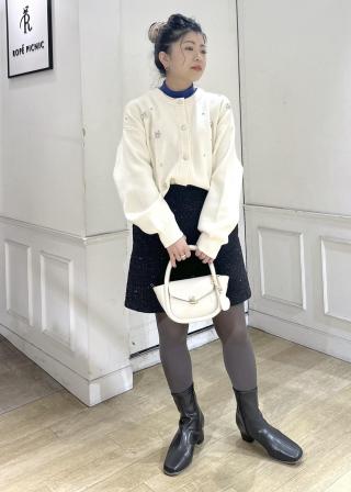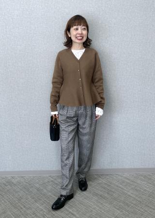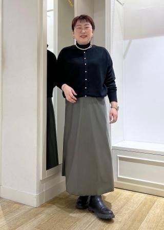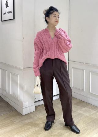 (右)やわらかな素材、透け感、コンパクトな着丈、とウェーブが似合う要素満載のカーディガン。袖をたくしあげて、すらりと細い手首を見せる着こなしもオススメ。ボタンをしめてプルオーバーとしても使える便利な1枚です。