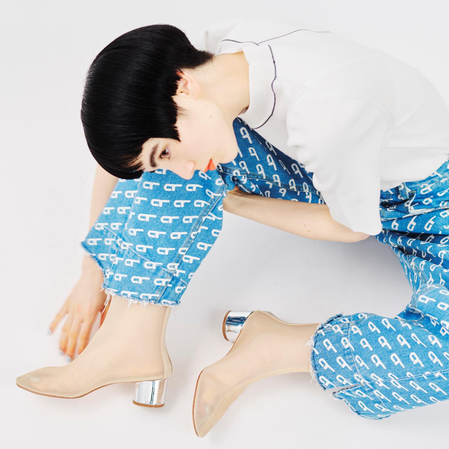 カジュアルなスタイリングにも抜け感をプラス。キラっと光るミラーのヒールで後ろ姿まで抜かりなく。