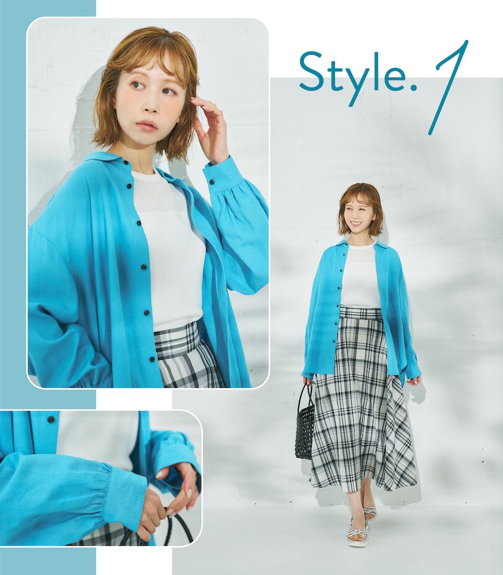 簡単に着回しできるボタンシャツをまずはゲット。今年人気のターコイズブルーを選べば、コーディネイトが一気に明るく。品の良いチェックのスカートと合わせて、大人っぽく着こなそう。