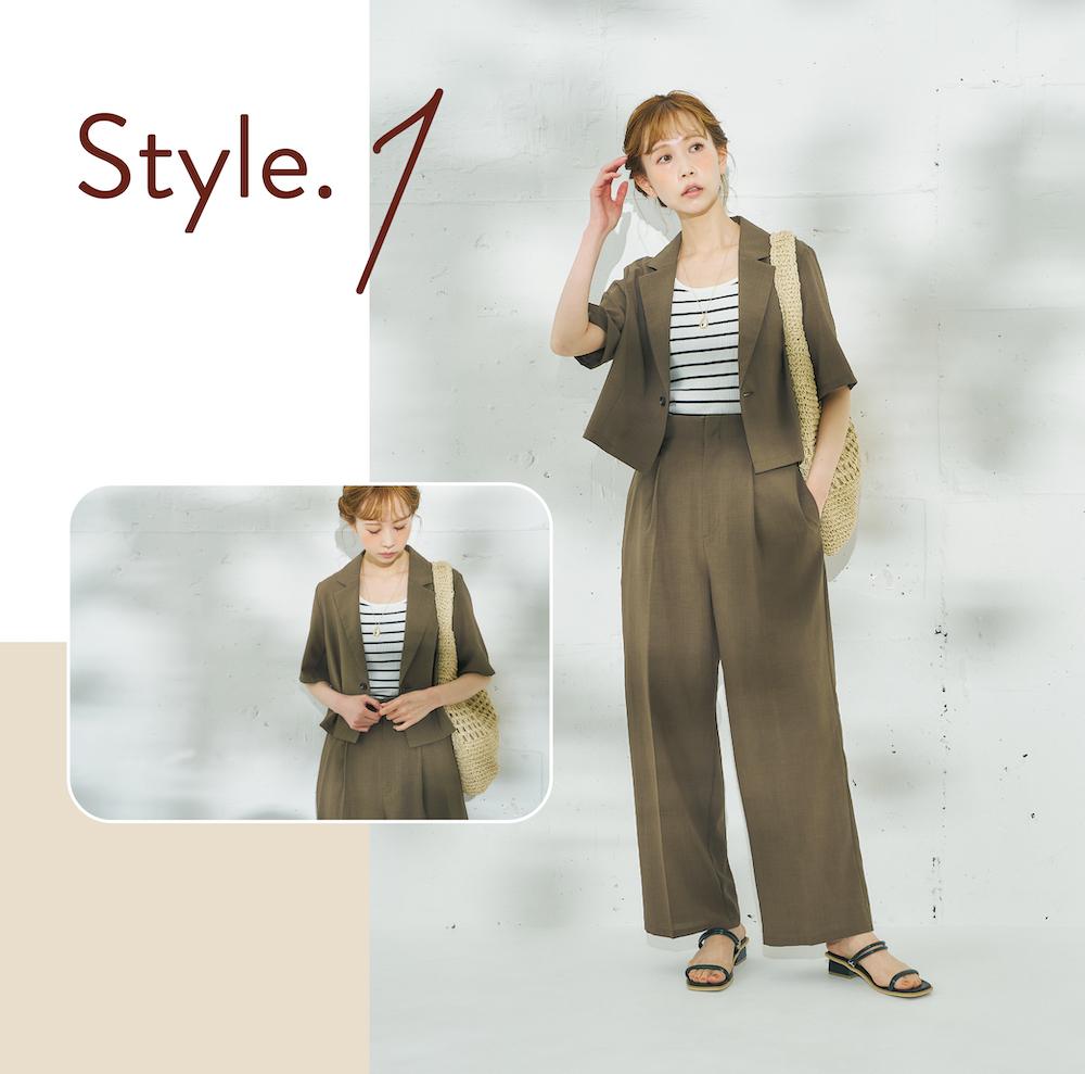セットアップのジャケットとパンツはそれだけでコーディネイトが決まる優秀アイテム。インナーにシンプルなボーダートップスを合わせると、かっちりしすぎず、おしゃれな着こなしに。