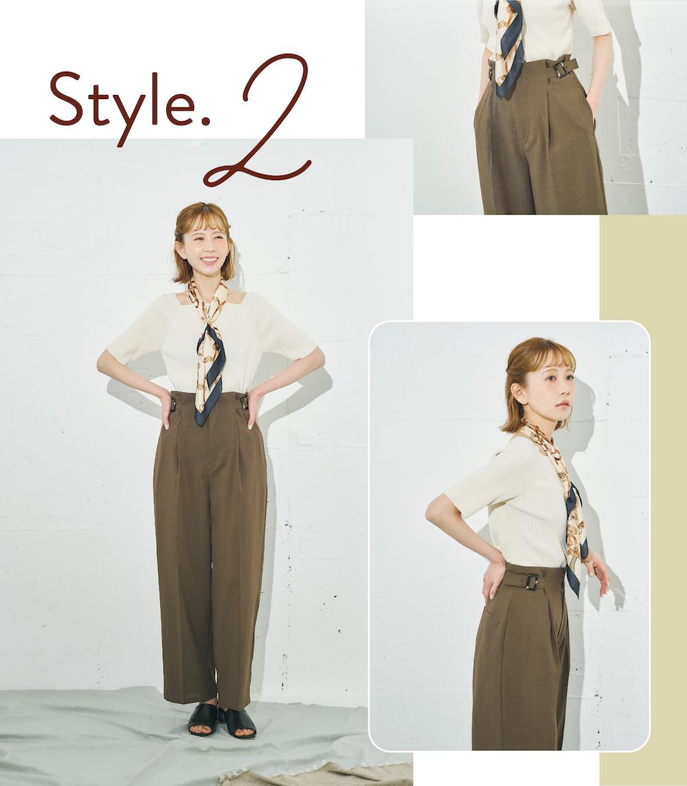 シルエットがきれいなパンツだから、トップスをインして着るのもおすすめ。スカーフを合わせてレディなコーディネイトに。