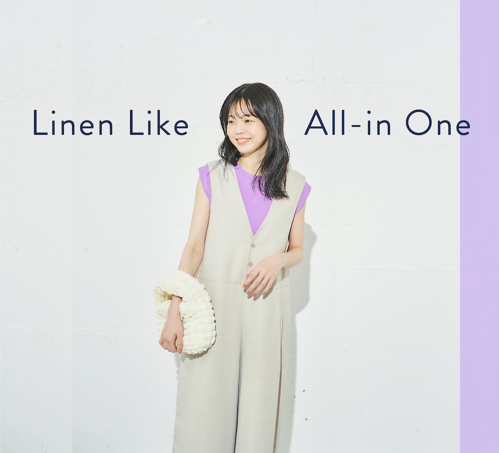 麻調のオールインワンにパープルのノースリーブトップスを合わせて。夏らしく、爽やかなコーディネイトに。