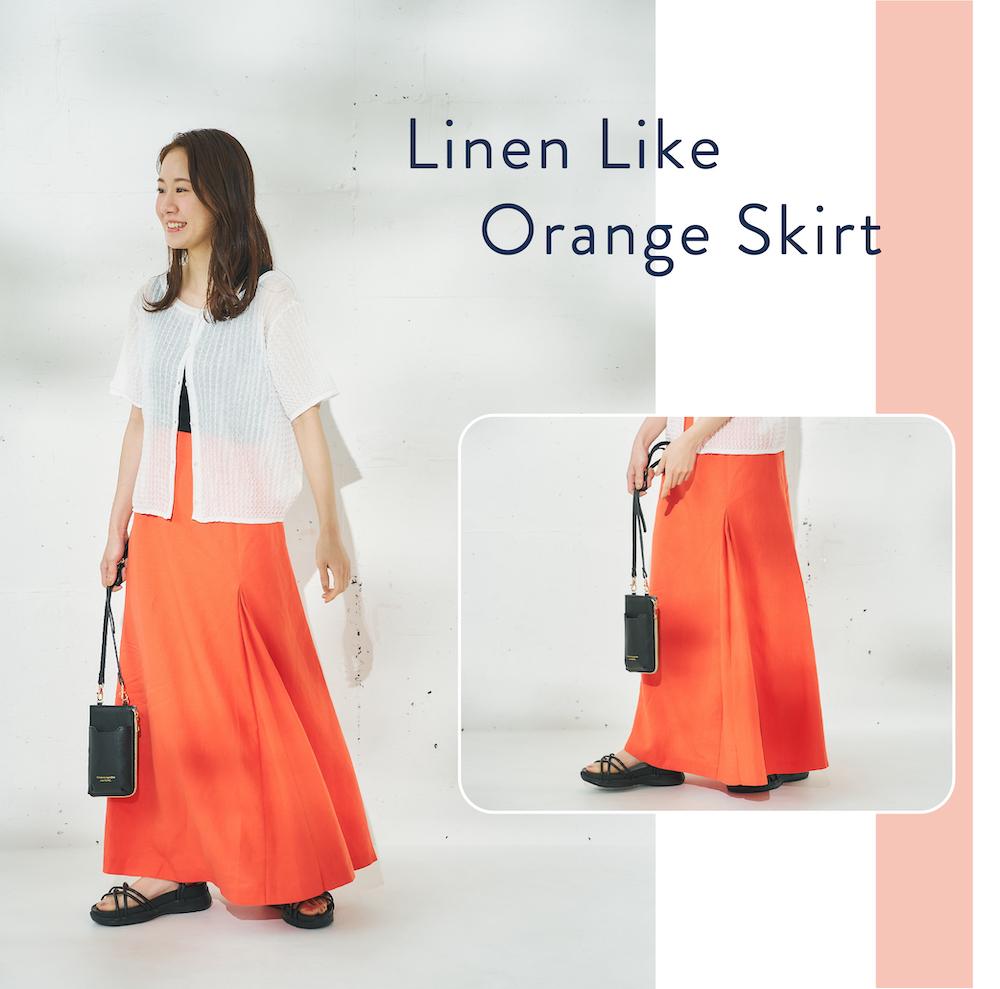 今年らしいオレンジのリネン調スカートはモノトーンで合わせてすっきり。スマホケースやサンダルで小物も身軽に。