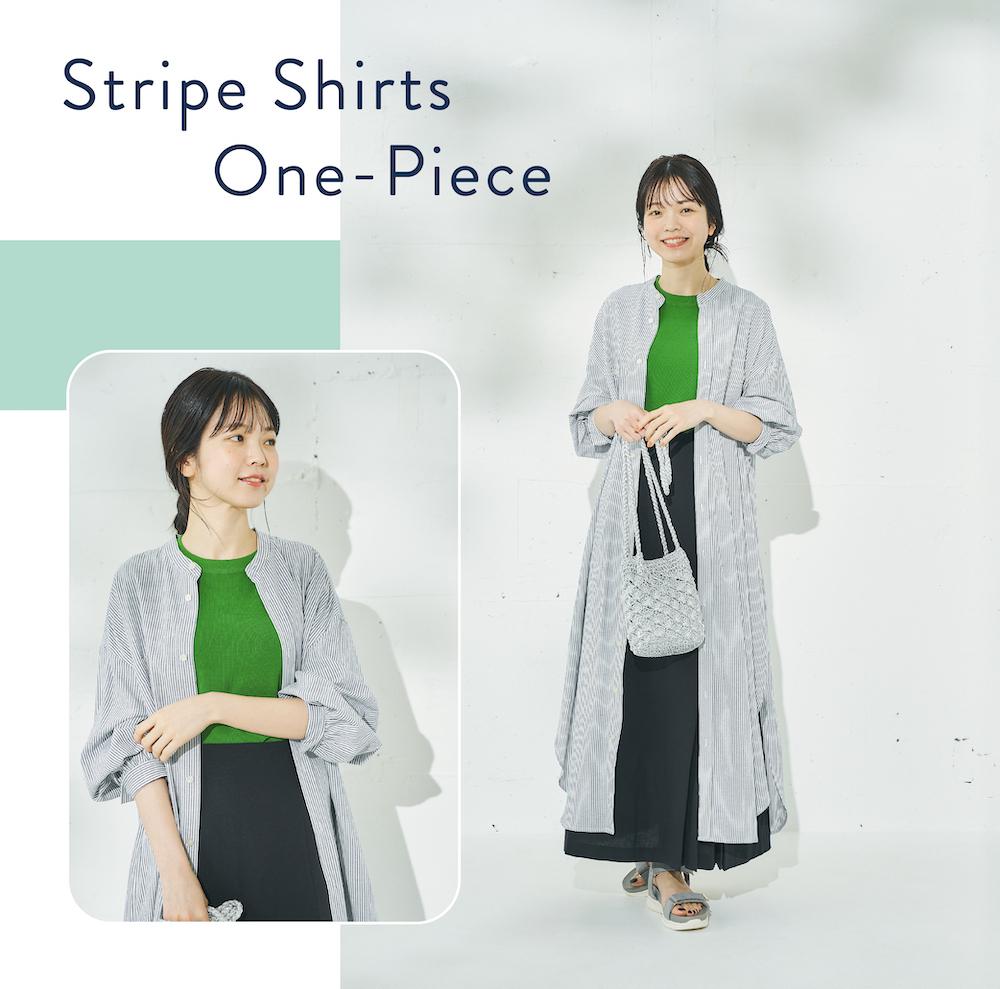 リネンの良さが際立つストライプのシャツワンピースは上から羽織る着こなしも◎。袖をまくったときのボリューム感が可愛い。