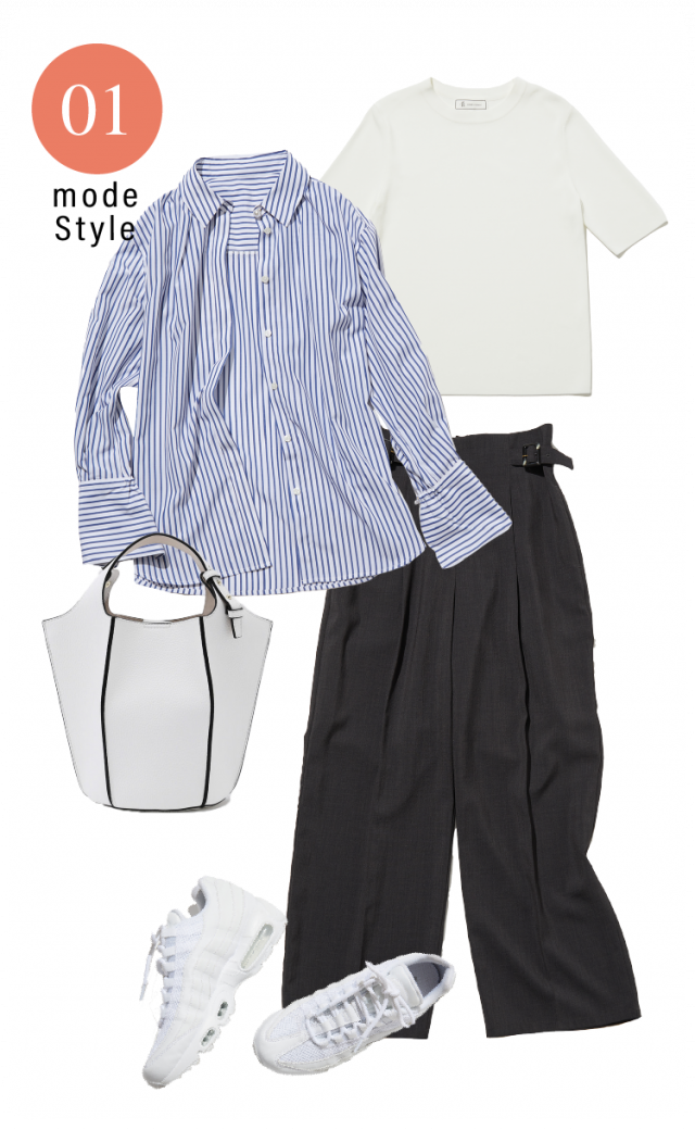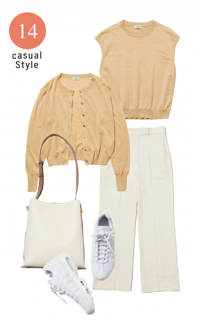 冷房対策にも便利なトップスとカーディガンのセット。一見地味になりがちな色味のコーデも、足元をあえてハイテクスニーカーで外すことで、今年らしいスタイルに。