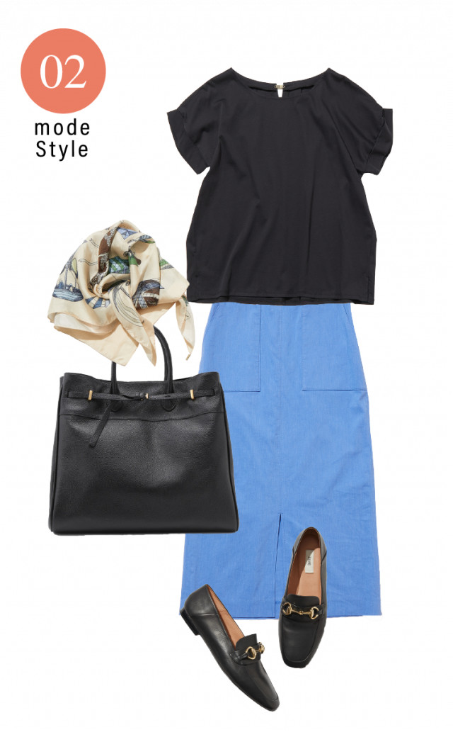 ゆったりめのボリュームトップスは、ブルーのタイトスカートにインしてすっきりとしたIラインを演出。ブラックで統一した小物に人気のアンティーク調のスカーフを合わせて、女性らしさもプラスして。