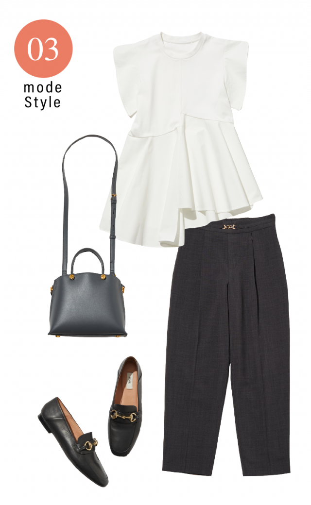アシンメトリーなシルエットが特徴のトップスは、あえてモノトーンスタイルでコーディネート。黒と相性の良いゴールド金具のアイテムで統一することで、上品な印象に。