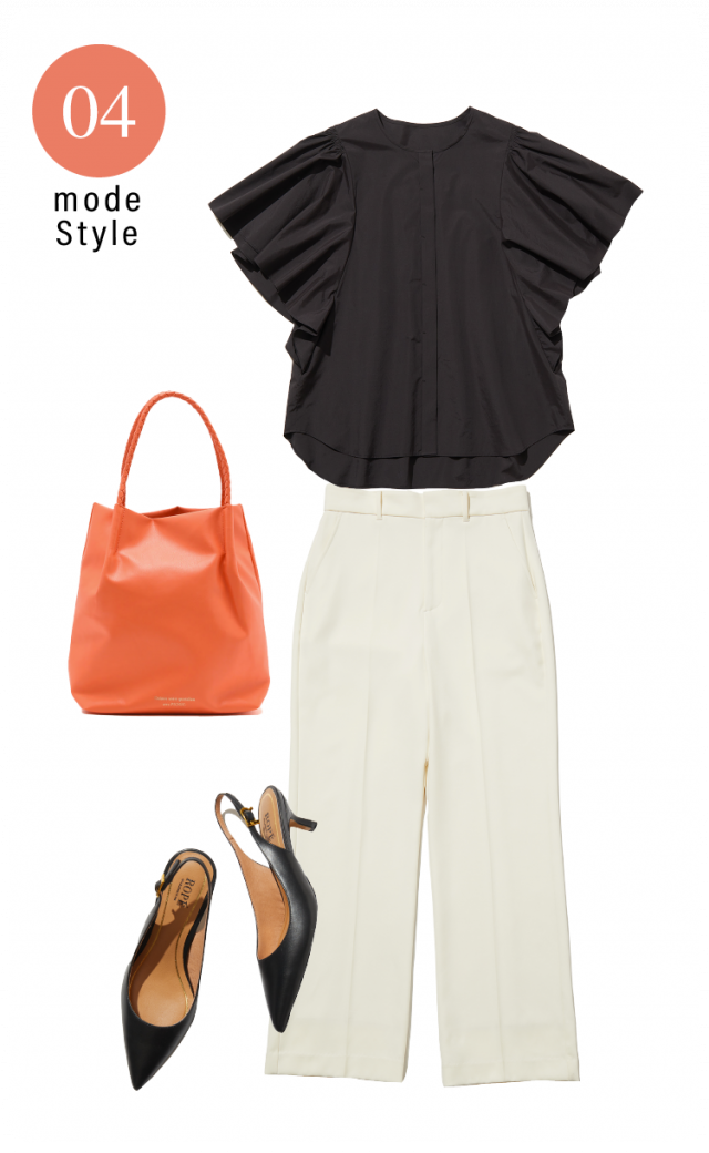 二の腕部分にボリュームのあるトレンド感満載の黒トップスは、重くならないように白のボトムでバランスを。小物に鮮やかなカラーを差し込むことで、シンプルながらも華やかな印象に。