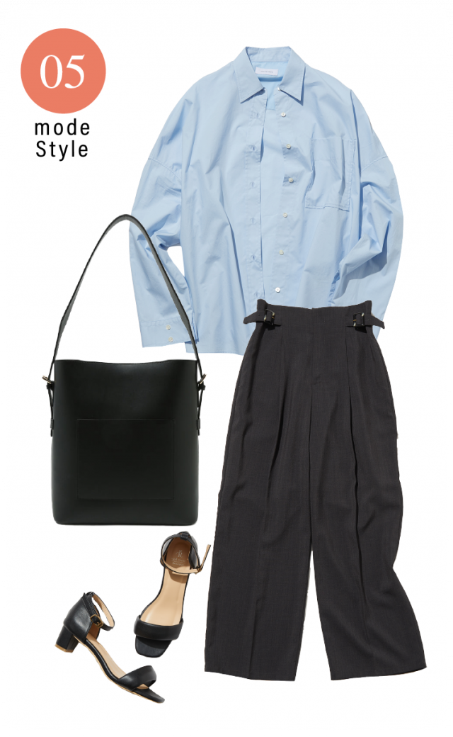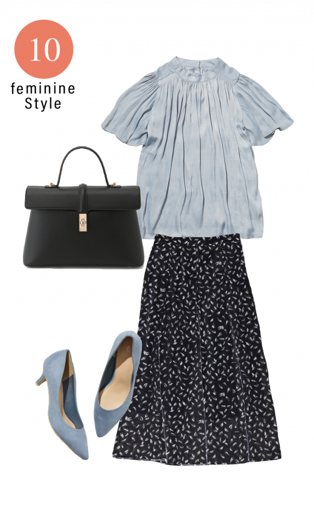 とろみ感のあるサックスブルーのトップスは、合わせ方次第では幼い印象になりかねないので、スカートとバッグの黒を合わせて大人っぽい印象に。