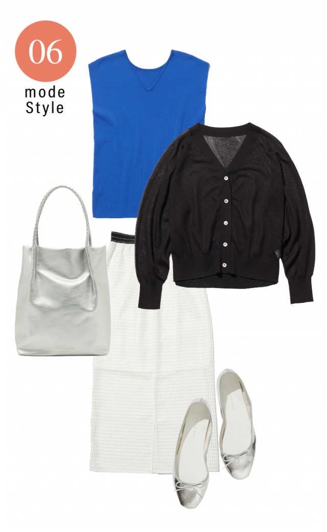 トレンドカラーのブルーのトップスは、モノトーンスタイルでバランスをとって。小物をシルバーに統一することで、トレンドを感じさせつつ上品な印象に。冷房対策のカーディガンは、今年は“透け”素材がおすすめです。