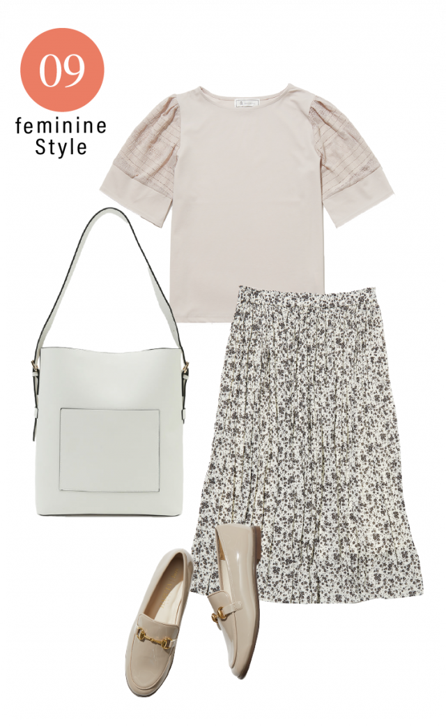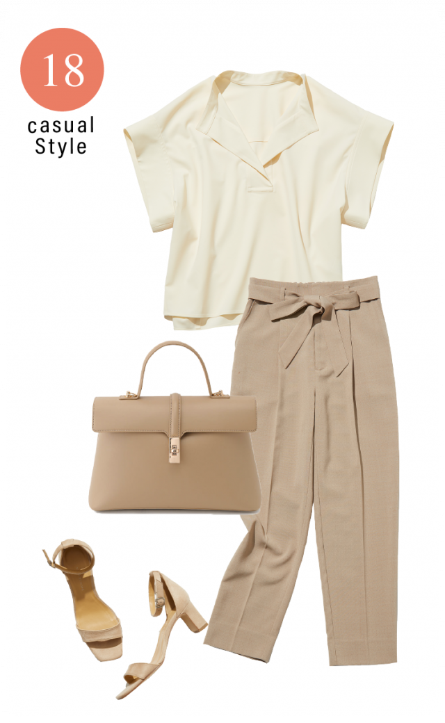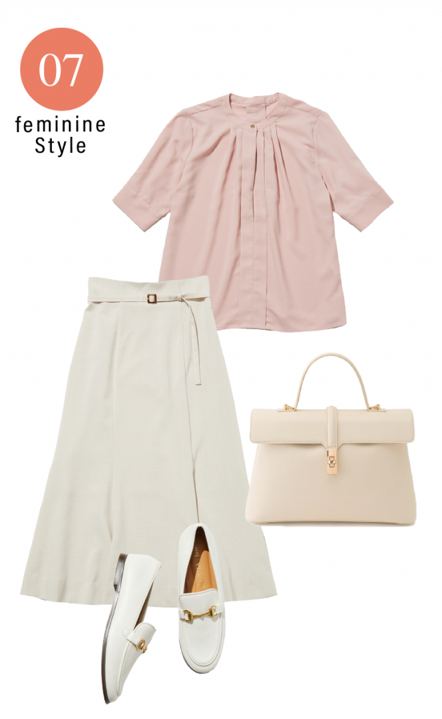 女性らしさを感じさせるベージュピンクを主役としたスタイル。小物をワントーンに抑えることで、より柔らかな印象に。