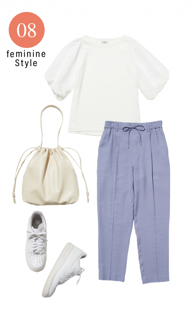 少しダフッとした大きめトップスは、ウエスト部分にリボンがあるパンツにインして、ゆるさとカチッとさのバランスを。足元は同系色のサンダルが正解!