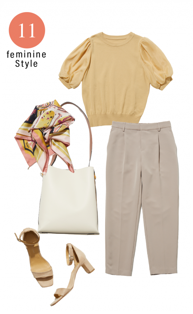 オフィス内をパッと明るくしてくれる上品なイエローのトップスを主役に、あえて色味の近い同系色でシンプルに。トレンドのスカーフをプラスすることで、華やかさと上品さをプラス。