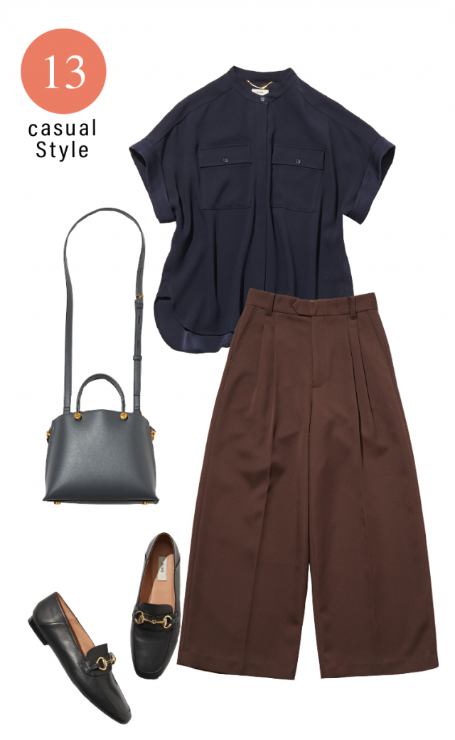 メンズライクなワイドパンツには、あえてとろみ感のある上品なネイビーのトップスを。バッグを小さめサイズにすることで、暗い色味でも重たくなりすぎず、できる女を演出!
