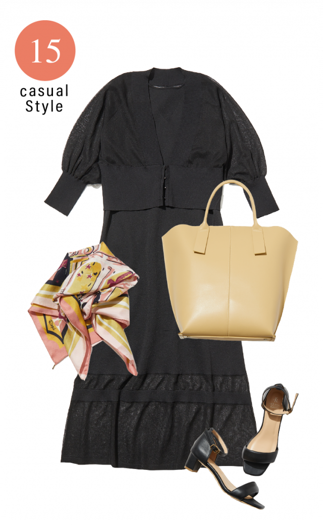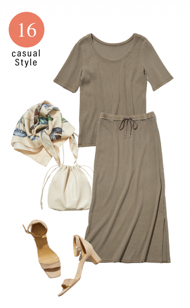 気持ちの良いリラックス感のある素材のトップスとスカートも、ヒールのあるサンダルと上品なスカーフを合わせることで、立派なオフィスカジュアルコーデに。