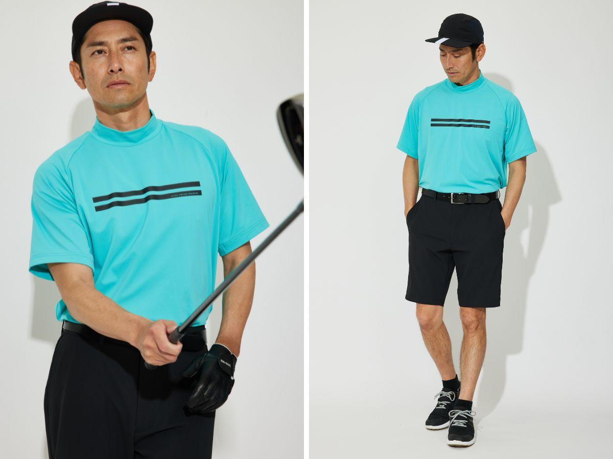 シンプルなモックシャツは、胸のワンポイントのラインプリントでスポーティーでスッキリした印象に。また、スウィングの傾きなどをチェックするガイドラインになるようにという意味も込められています。透け感を抑えながらも、ストレッチの効いた機能素材を採用。