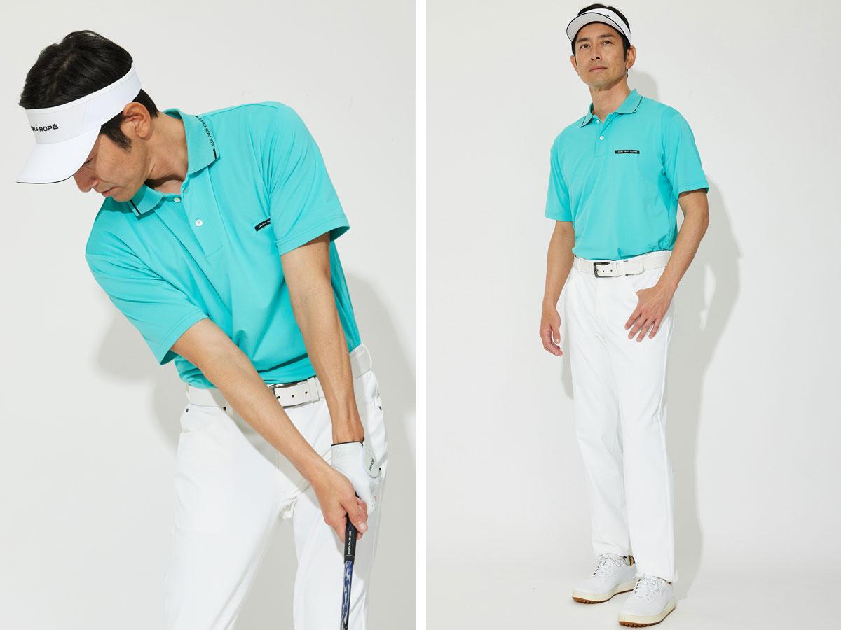 UV・吸水速乾が特徴の機能素材を用いた定番ポロシャツは、運動性を向上させた設計を追加。脇下に配したパネル切替をベースに独自のカッティング理論を搭載し、さりげなくスウィングしやすく運動性を向上。透け感を抑えながらも、ストレッチの効いた素材使いは、まさにJUN&ROPE'らしい一着。襟についたラインとボディのミントブルーのバランスが秀逸です。