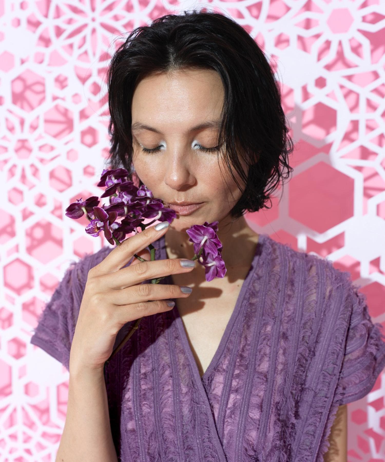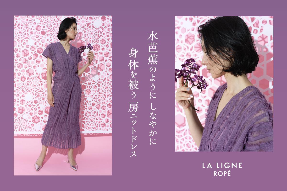 多角形の編み地を纏わせたカシュクールドレスは、水芭蕉の苞を一枚、くるりと身体に巻いたようなシンプルなシルエットが特長。