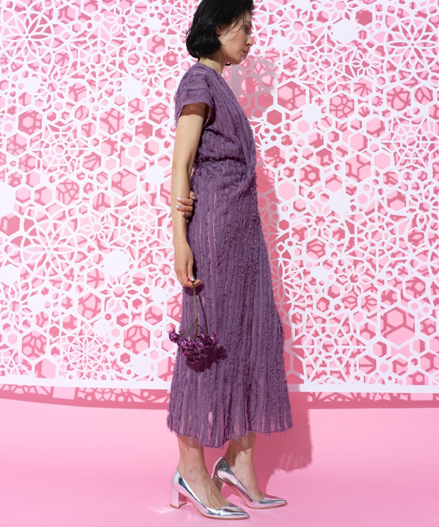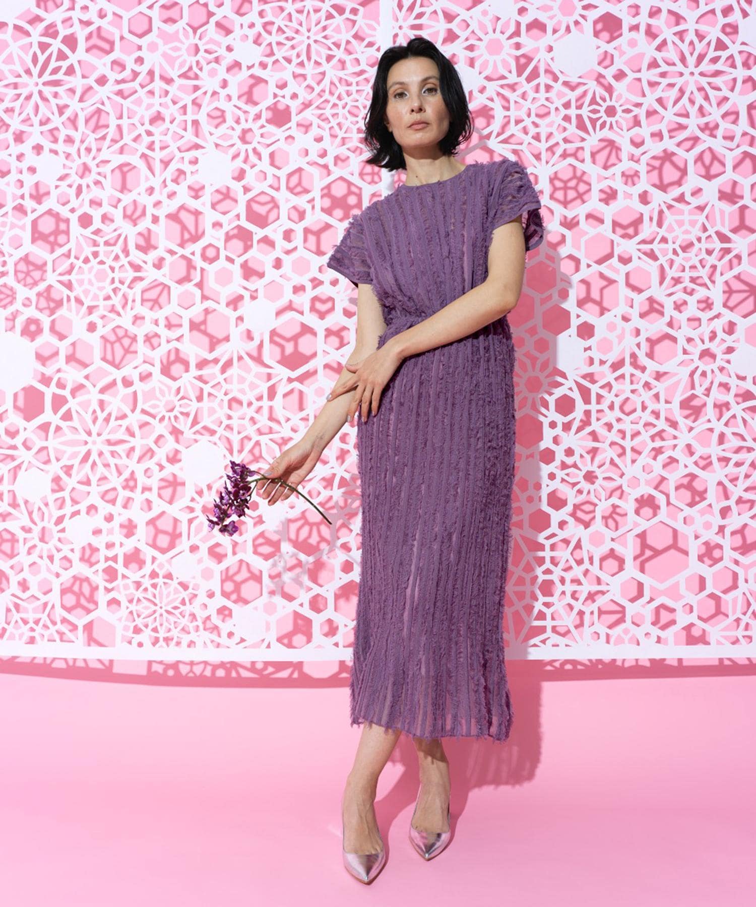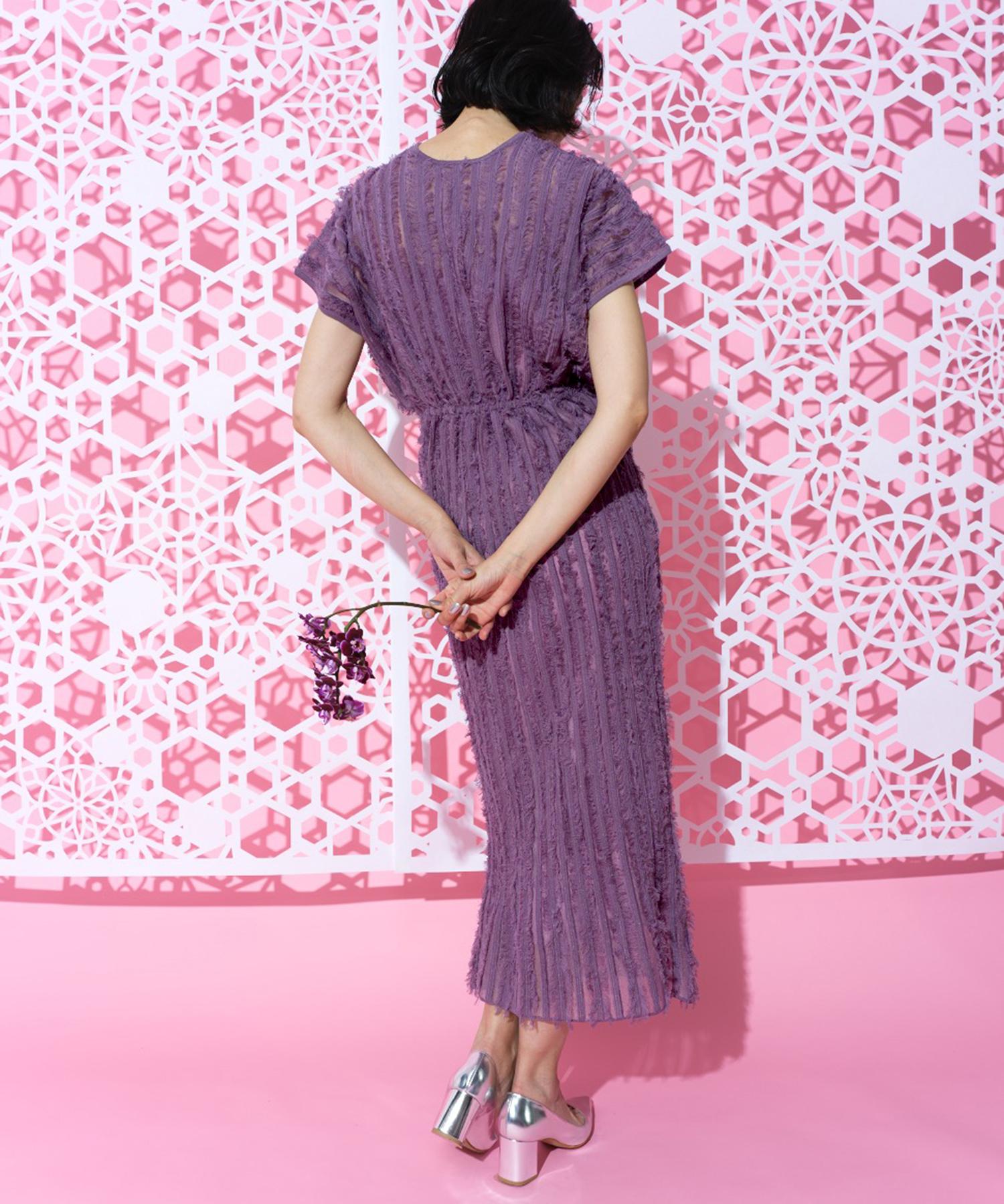 ストレッチの効いた、房(フリンジ)のテクスチャーが有機的で女性らしさを一層、際立たせます。