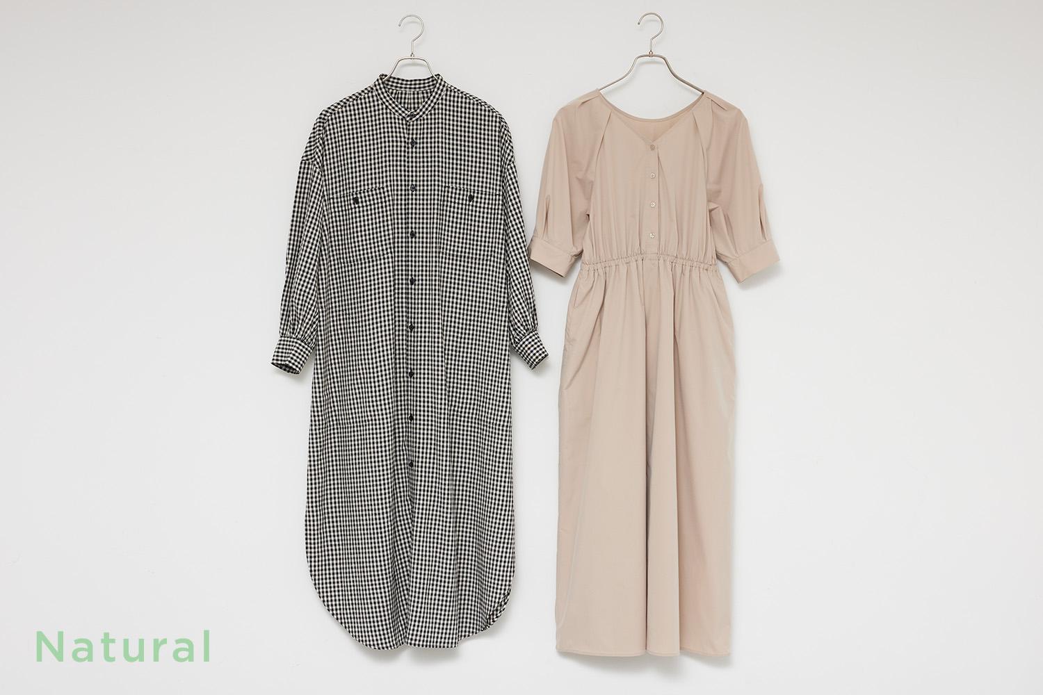 (左)リラックス感のある麻混素材のシャツワンピース。背中に入ったタックやサイドに入ったスリットがつくるルーズなボリューム感が、ナチュラル向き。ワンピとしてだけでなく、ワイドパンツやロングスカートとレイヤードし