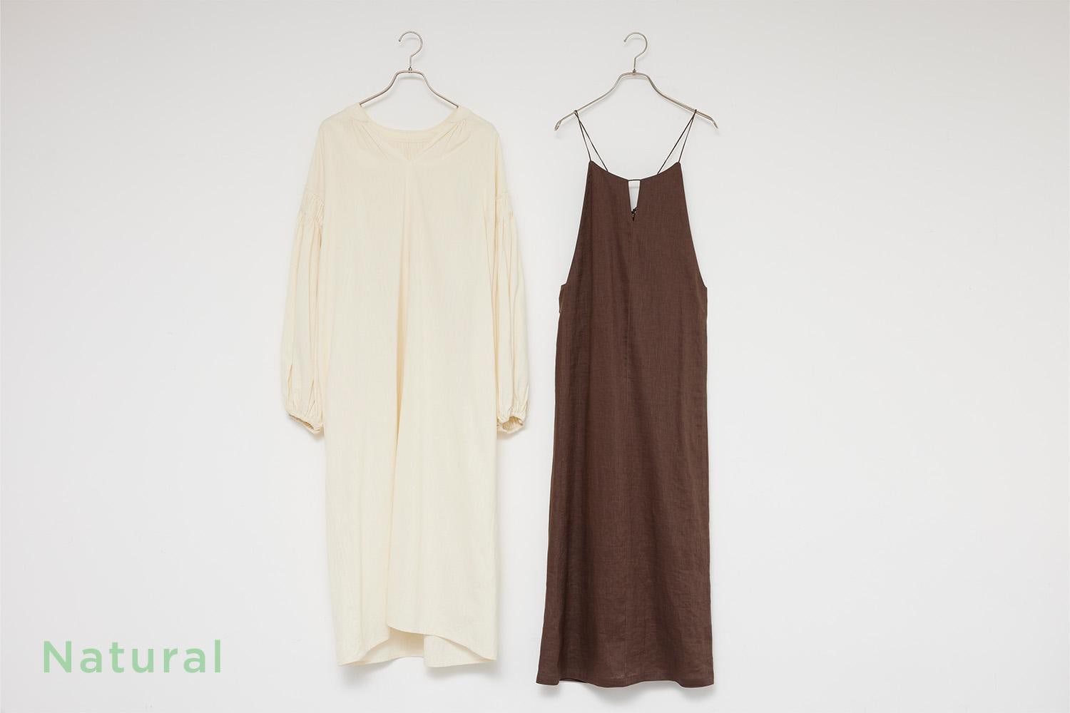 (右)リネン素材のキャミワンピは、天然素材が得意なナチュラルにベストマッチ。高品質として知られる、フランスノルマンディ地方のリネンを使用しているので、ナチュラルな風合いのなかに上品な光沢感があるのも魅力。リゾートでもタウンでも活躍する1枚です。