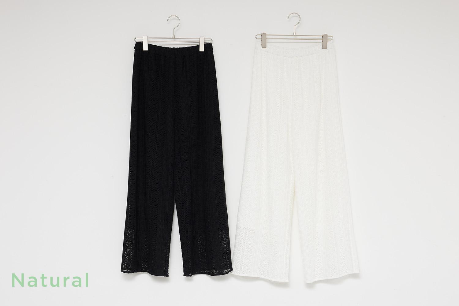 クロシェ調の素材はナチュラルの得意分野。ワイドなシルエットを選んで