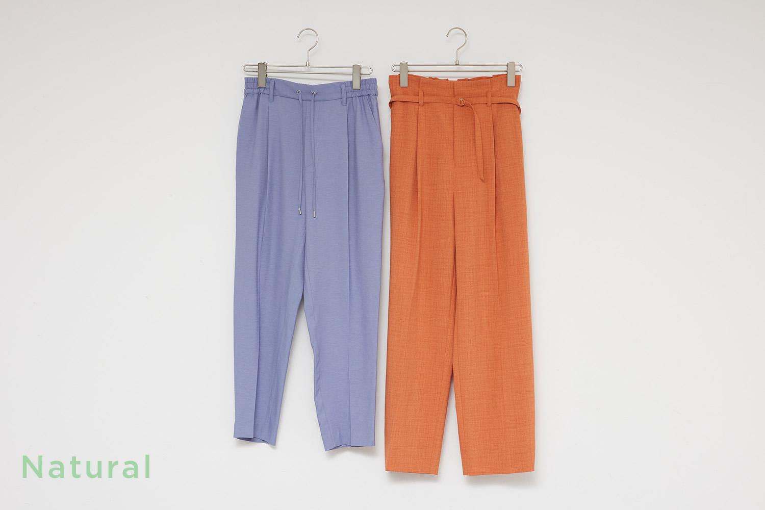(左)ゆったりとしたシルエットが映えるナチュラルは、イージーパンツが得意。リネンライクな素材も似合うポイントです。トップスを選ばないので、1本あるとオフィスにもカジュアルにも使える万能アイテム。接触冷感機能つきで、家で洗えるところも◎。