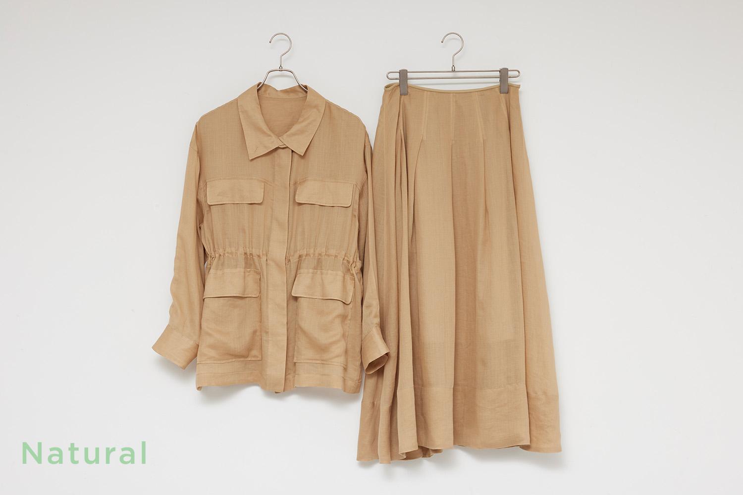 (左)たっぷりと生地を使ったラミー素材のサーキュラースカート。裾のボリューム感と、麻のドライな質感がナチュラルに似合います。ラフなシャツと合わせればデイリーに、サファリジャケットとセットアップで着れば、リラックス感のあるエレガントなスタイルが完成します。