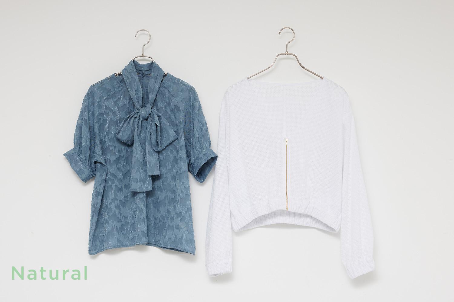 (左)1枚で存在感のある、シアージャガードのボウタイブラウス。スタイリッシュなボディラインがあるので、個性的な素材や柄も難なく着こせます。ナチュラルなら、上品な印象のブラウスにデニムを合わせて、カジュアダウンさせても似合います。