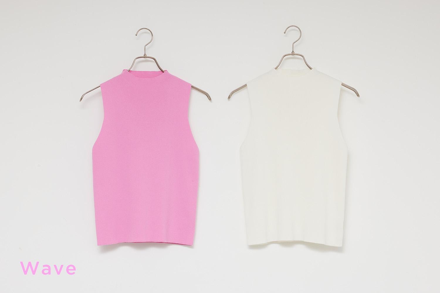 やわらかな曲線が活かせるリブ素材は、ウェーブが似合う鉄板アイテム。ノースリーブのリブニットなら、細い腕がすらりと見えて、さらにオススメです。上半身がすっきりコンパクトにまとまるので、ボトムはフレアスカートなどを合わせて、バランス調整を。上半身に華やかさをプラスしたいときは、華奢なアクセをオンしても◎。