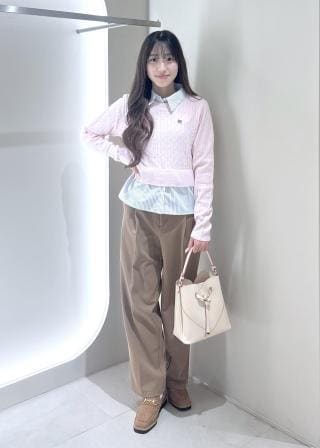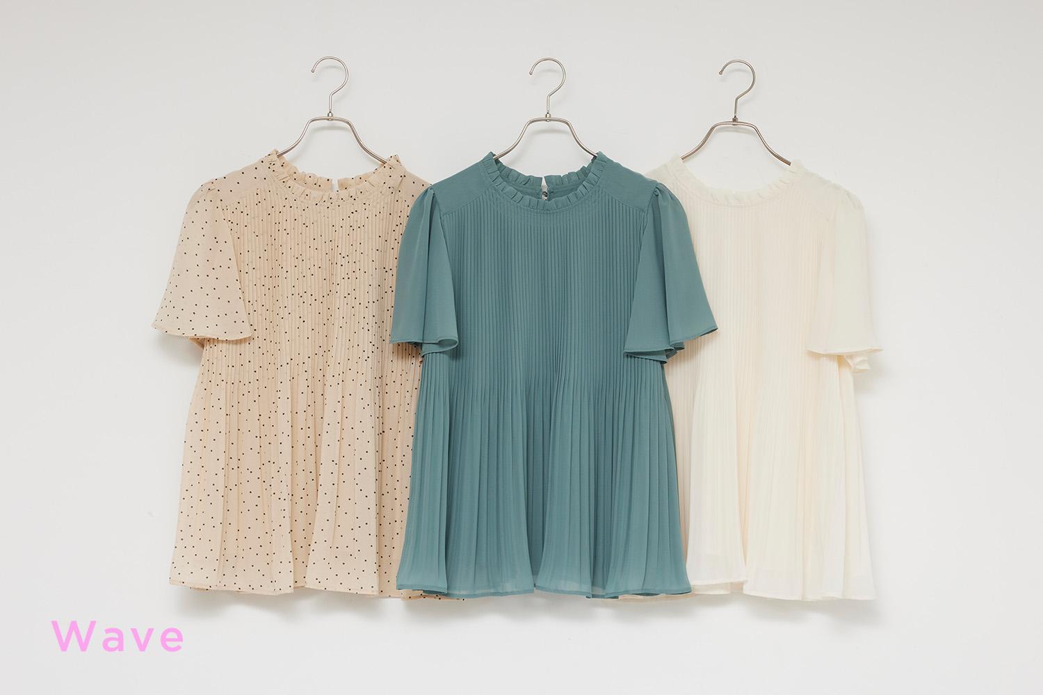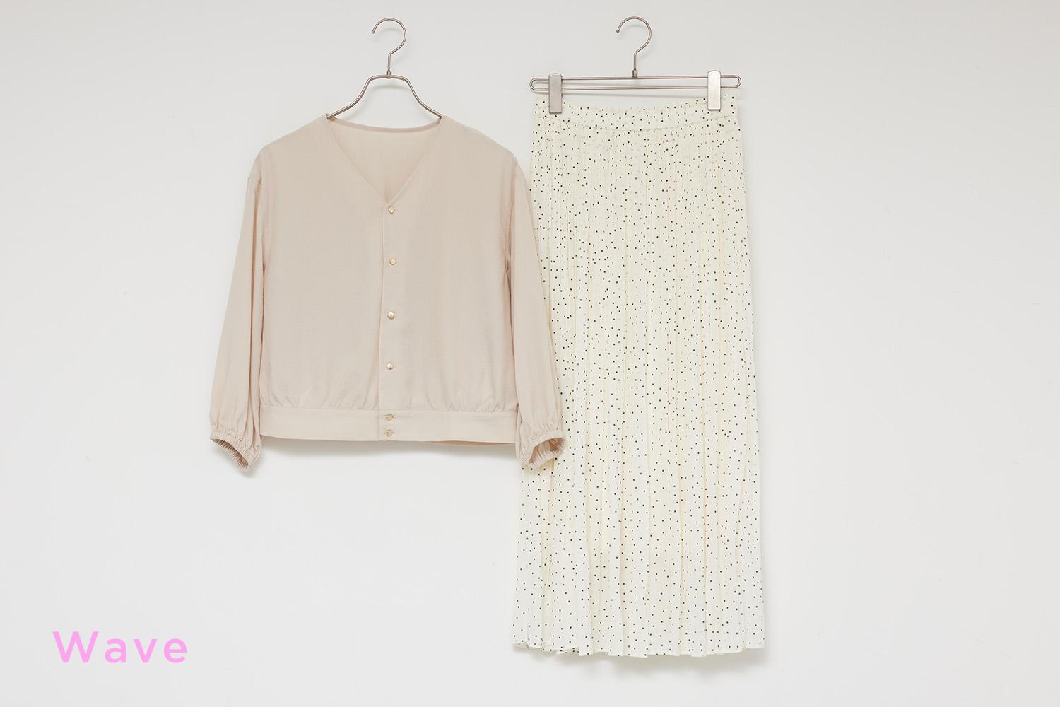 薄手のやわらかい素材のブラウスは、ウェーブの得意アイテム。首元のフリル、フレアスリーブ、繊細なプリーツと似合うエッセンスが満載。コンパクトな着丈が似合うウェーブですが、軽やかでフェミニンな印象のブラウスなら、アウトしたまま細身のパンツを合わせてもOK。靴も華奢なものを合わせるとバランスよくまとまります。