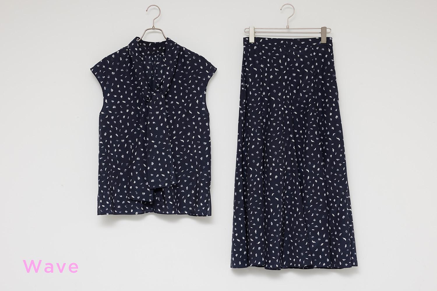(左)花びら柄をドットのように散りばめたブラウス。キュプラ混の繊細な質感がウェーブの肌になじみます。フレンチスリーブは細い二の腕をアピールし、ボウタイはさみしくなりがちな胸元にアクセントをプラス。スタイルとオシャレ度が両方アップする1枚です。