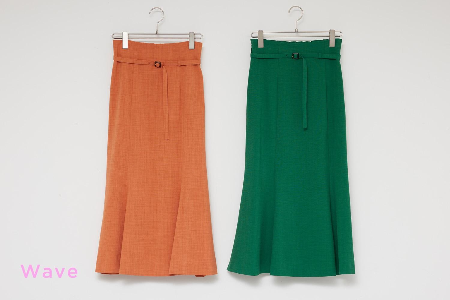 腰の位置が低めなウェーブの重心を上げてくれる、ハイウエストのスカート。アクセントのベルトがさらに目線をひき上げ、バランスアップさせます。ウエストまわりをすっきりと見せ、裾にむかって流れるようなラインをつくるマーメイドスカートは、脚長効果も期待。揺れ感の出る軽やかな素材を選ぶことも忘れずに。