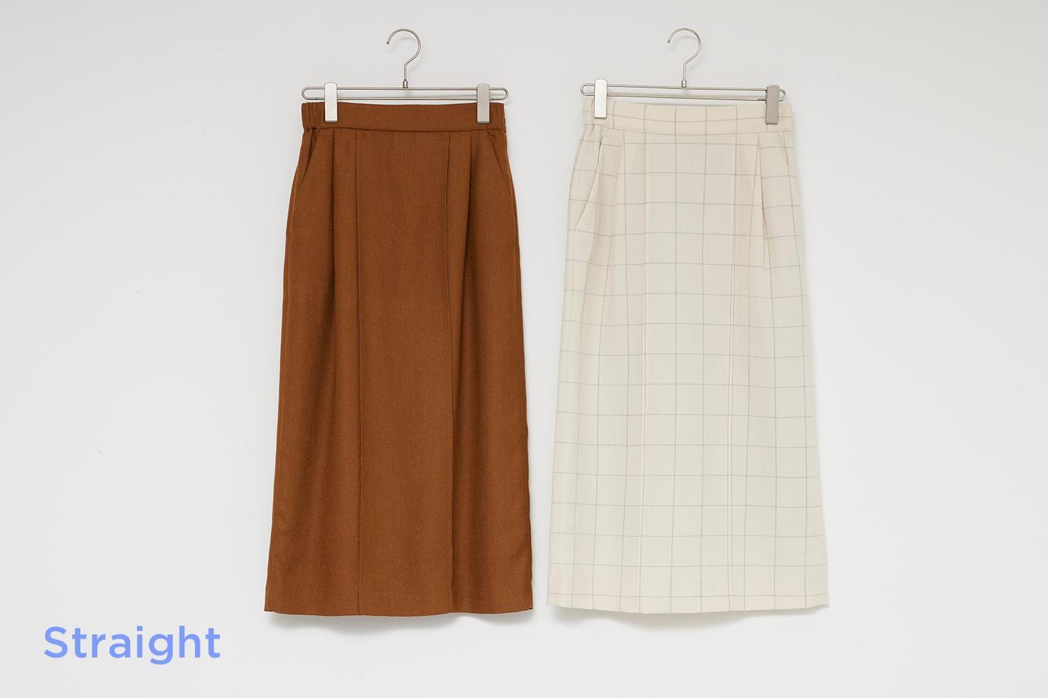 ストレートは、立体感のあるボディをすっきり見せるIラインをつくるのがコツ。気になる太ももはカバーしつつ、タテ長のシルエットができるタイトスカートは必見です。本来ノータックが得意ですが、ピンタックならIラインを強調できるので◎。シワになりにくい素材感も正統派スタイルが得意なストレートに似合うポイントです。