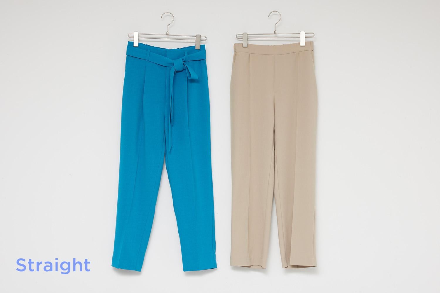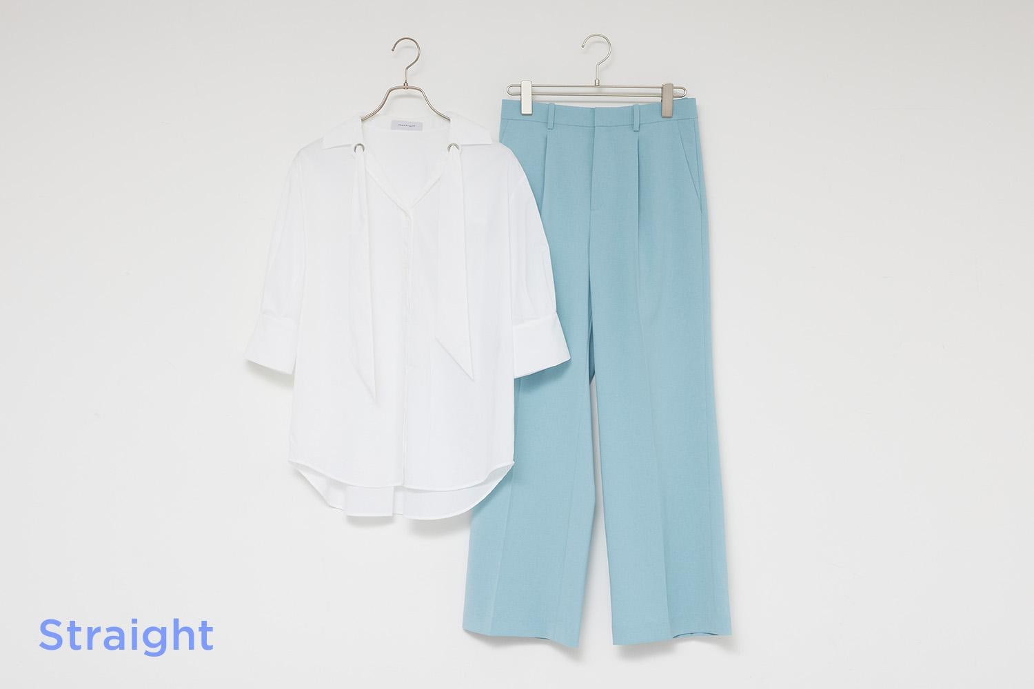 (左)ストレートの細見えキーワードは「Iライン」。パンツもセンタープレス入りがオススメです。すっきりとしたシルエットがキープできる、シワになりにくい素材を選ぶのも春夏のパンツ選びのコツ。ターコイズなら初夏らしいさわやかさもプラスできます。