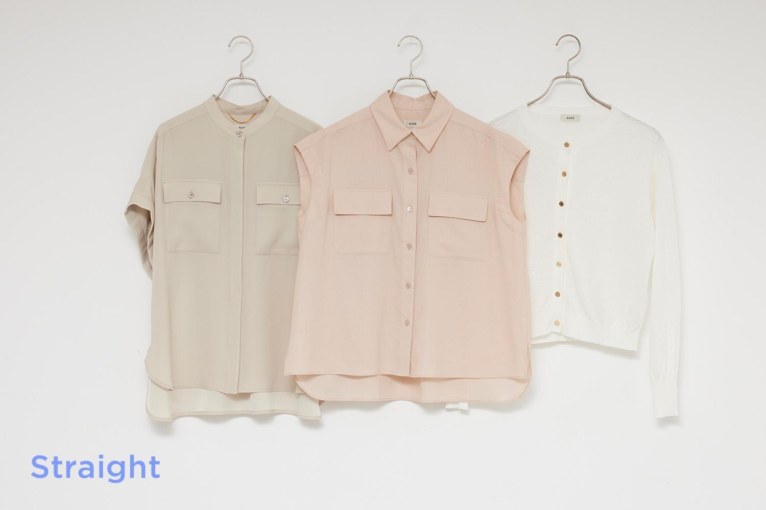 (左)クラス感のあるスタイルが似合うストレートは、ジャストサイズのシャ ツが得意。首元がVに開いたデザインは、ボリュームのある上半身をすっきり見せます。ドライな質感で紫外線防止効果もあるシャツは、これからの季節に1枚は持っていたいアイテムです。